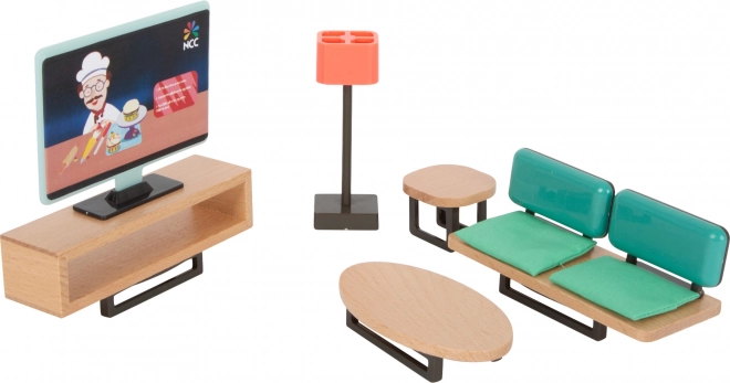Un divano elegante, un tavolino e la TV creano il cuore accogliente della casa. Ideale per raccontare storie e sviluppare la fantasia.