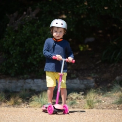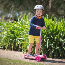 Il manubrio è regolabile su tre livelli di altezza – 58 cm, 67 cm e 76 cm – permettendo al monopattino di crescere insieme a vostro figlio. È dotato di freno posteriore per aumentare la sicurezza durante la guida. La struttura combina plastiche robuste e atossiche con leghe leggere, per renderlo leggero e facile da manovrare.