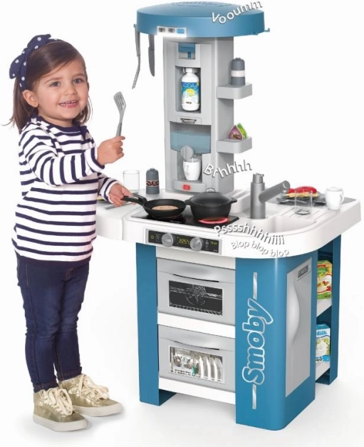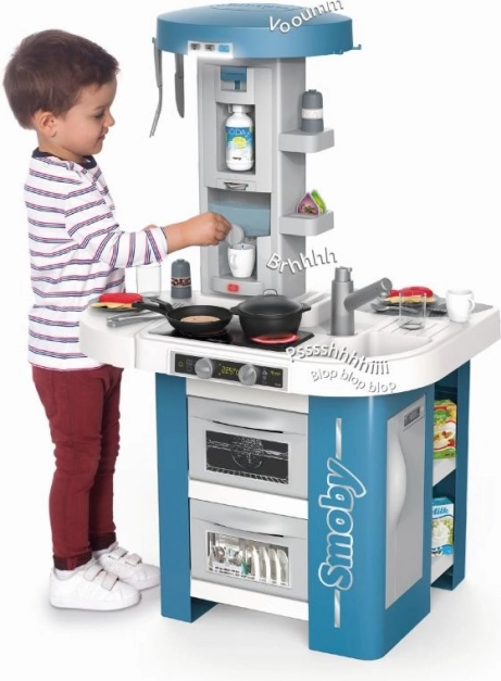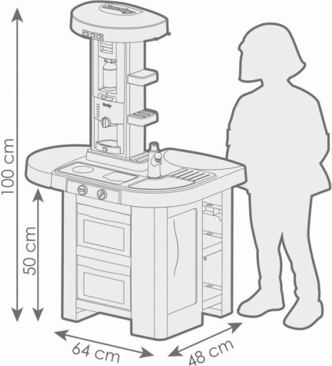 Il piano di lavoro è dotato di un moderno piano cottura elettronico con due suoni di cottura e luce rossa per simulare la vera cucina. La macchina da caffè interattiva con serbatoio ricaricabile imita il processo di preparazione del caffè, mentre la cappa offre tre livelli di rumore con illuminazione.