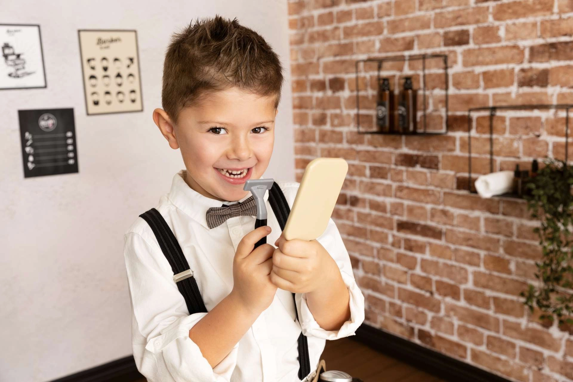 Specchietto, forbici, pettine, pennello, rasoio giocattolo e altri accessori offrono ore di divertimento creativo e sicuro per bambini dai 3 anni.