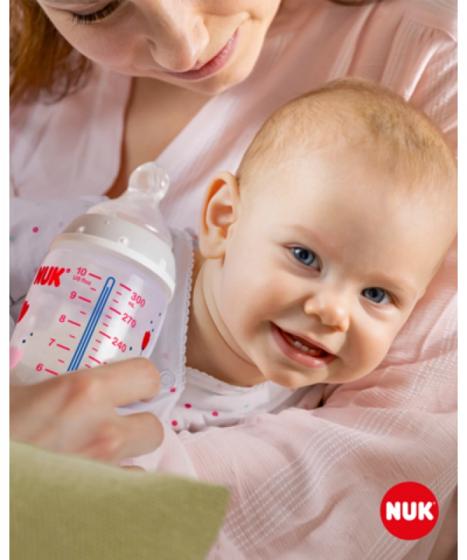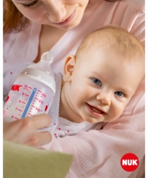 Il controllo della temperatura aiuta i genitori a raggiungere la temperatura ottimale e a garantire un’alimentazione sicura del loro bambino. Alimentazione tranquilla e sicura grazie al controllo della temperatura. Quando il bambino ha fame, il contenuto del biberon non dovrebbe essere né troppo caldo né troppo freddo. Per questo mamme e papà controllano la temperatura prima di ogni pasto. Non è facile capire quando la temperatura è quella giusta. Per questo sono stati sviluppati i biberon NUK First Choice+ con funzione di controllo della temperatura, una novità in questa forma. I biberon NUK First Choice+ sono ora dotati di un nuovo indicatore di temperatura che aiuta a evitare che il bambino beva una pappa troppo calda. L’indicatore, simile a un termometro, è posizionato tra le tacche e cambia colore in base alla temperatura del contenuto. Questa funzione aiuta i genitori a raggiungere la temperatura ottimale durante l’alimentazione del loro bambino. Se la pappa è troppo calda, l’indicatore blu diventa bianco. Idealmente, la pappa dovrebbe avere la temperatura corporea (37 °C), corrispondente alla colorazione blu del display. Attenzione: il controllo della temperatura è pensato come verifica aggiuntiva. Prima dell’alimentazione è necessario controllare la temperatura anche manualmente. Per verificarla, consigliamo di far cadere alcune gocce dell’alimento sull’interno del polso. La tettarella più naturale per il tuo bambino. Da molti anni, i biberon First Choice sono la prima scelta per un’alimentazione al biberon ispirata all’allattamento. Con First Choice+ ci siamo avvicinati ancora di più alla natura: favoriscono il sano sviluppo della mascella e offrono al bambino la sensazione di bere dal seno materno. Naturalmente e correttamente sagomata per la mascella. L’esclusiva forma delle tettarelle NUK è modellata sul capezzolo della madre durante l’allattamento. La tettarella lascia spazio sufficiente ai naturali movimenti di suzione della lingua e della mascella del tuo bambino. Morbida come il seno materno. La tettarella in silicone, grazie alla nuova zona morbida, si adatta meglio al palato del tuo bambino, garantendo una sensazione naturale durante la poppata. Previene le coliche Il migliorato sistema Anti-Colic Air System garantisce un flusso uniforme dell’alimento senza ingestione d’aria. Clinicamente testato* Grazie alla forma eccezionalmente naturale della tettarella, i bambini la accettano molto bene. Ciò le rende particolarmente adatte ai bambini che vengono contemporaneamente allattati al seno e alimentati con il biberon. Biberon per neonati. pratico display NUK di controllo della temperatura, che cambia da blu (freddo) a bianco (troppo caldo) privo di sostanze nocive e odori – senza BPA facile da riempire e pulire – collo extra largo presa sicura e stabilità – grazie alla bottiglia leggermente sagomata e alla base larga combinazioni illimitate – compatibile con tutti i prodotti NUK First Choice *Studio scientifico: Moral et al. BMC Pediatrics 2010, 10:6. Maggiori informazioni su http://nuk.com/research. Indagine di mercato indipendente con 205 pediatri, Germania 2018. Il 99% delle madri ha confermato che il biberon NUK First Choice+ Control non causa coliche. Caratteristiche principali: la temperatura del contenuto cambia il colore dell’indicatore: se il pasto è troppo caldo, il blu diventa bianco ideale per la mascella del bambino, tettarella in silicone particolarmente morbido, 0–6 mesi M (foro medio = per alimenti per l’infanzia) clinicamente testato*: per un’ottimale combinazione di allattamento al seno e biberon design accattivante