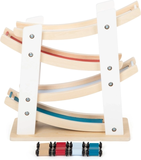 La pista è realizzata in legno naturale di alta qualità con base stabile e bordi levigati per un gioco sicuro dei più piccoli.