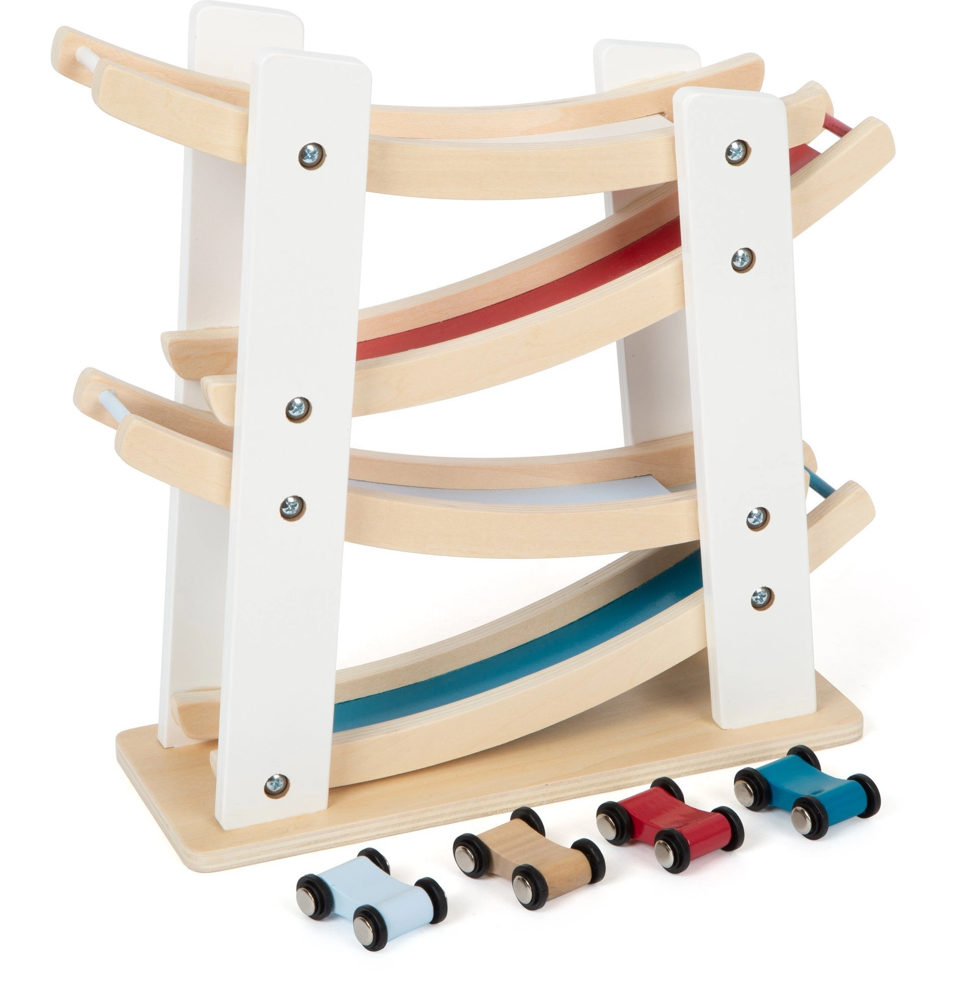 Questa pista in legno di qualità offre un principio semplice che i bambini adorano: posiziona la macchinina sul livello superiore e guarda come scivola velocemente lungo le curve fino in fondo. La base stabile e le superfici lisce garantiscono un utilizzo sicuro e duraturo.