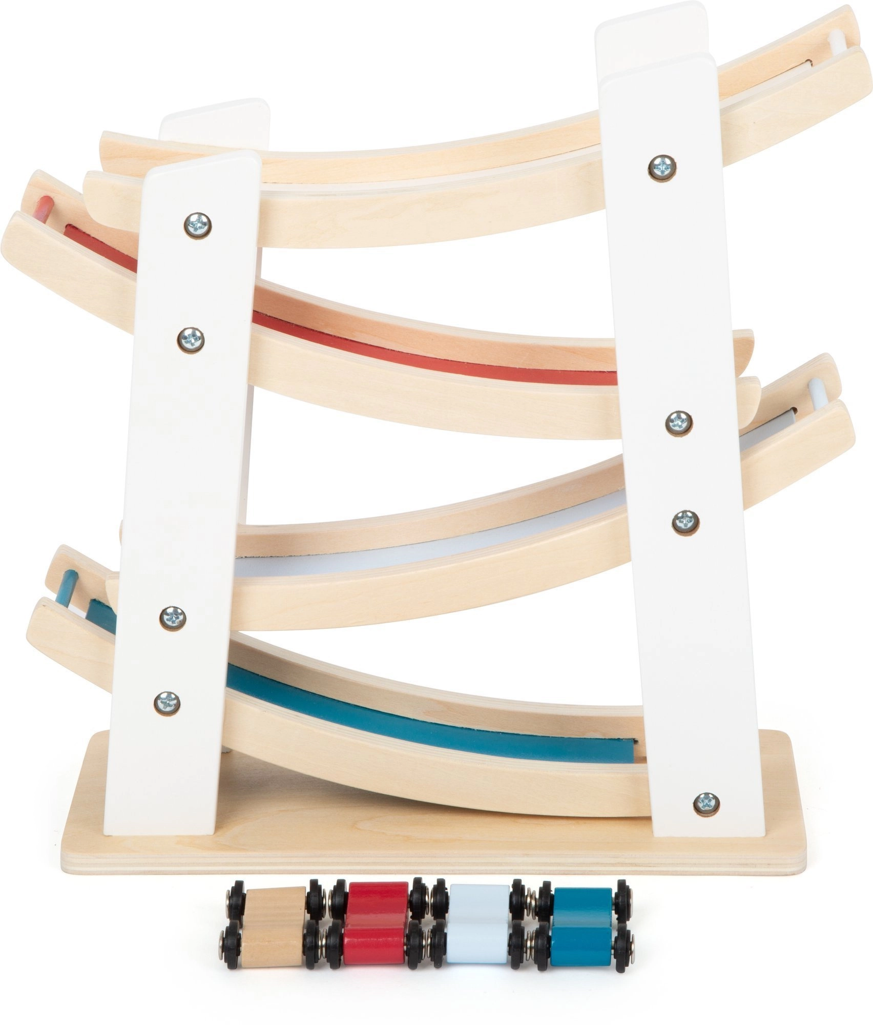 Le macchinine si posano in cima e scivolano velocemente sui vari livelli, favorendo la comprensione di causa ed effetto e allenando la coordinazione.