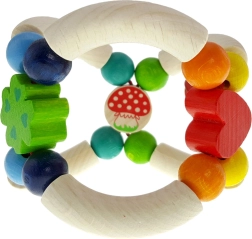 Il sonaglio in legno a forma di amanita è realizzato in legno di qualità e con una campanellina in metallo. La colorazione moderna e le finiture lisce sono delicate sulle mani dei bambini, mentre la struttura leggera ne facilita la presa. Il giocattolo è adatto ai neonati fin dalla nascita e favorisce la percezione sensoriale e i primi movimenti intenzionali.