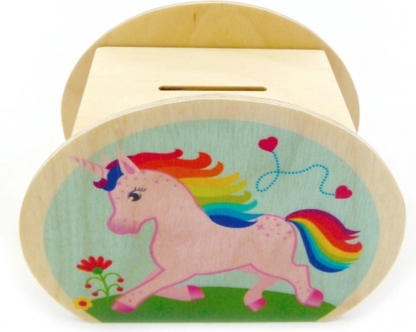 Questo colorato salvadanaio con unicorno motiva i bambini all’educazione finanziaria e a comprendere il valore del denaro. La robusta lavorazione in legno naturale garantisce lunga durata e un piacevole aspetto naturale, che si inserisce perfettamente nella cameretta.