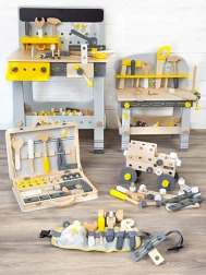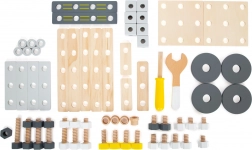 La confezione include ricchi accessori: listelli e tavole con fori preforati, cubi, ruote, adattatori per ruote, distanziali e due utensili in legno – chiave e cacciavite. Tutto si ripone in modo ordinato nel pratico box, così nessun pezzo andrà perso.