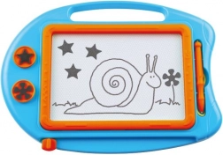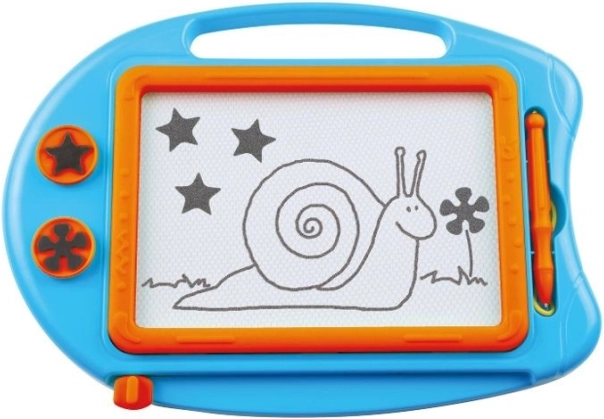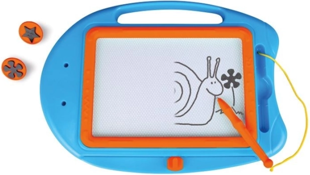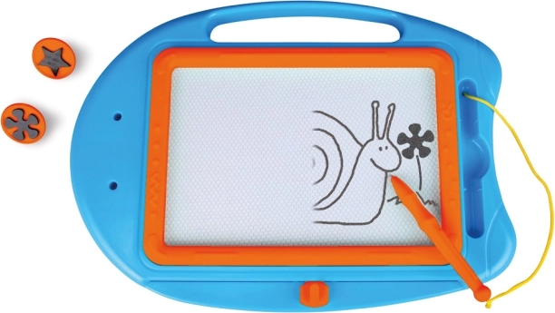 La superficie magnetica permette ai bambini di disegnare, scrivere e timbrare senza fogli e senza pastelli. Con un solo gesto l’immagine si cancella e si può ricominciare a creare.