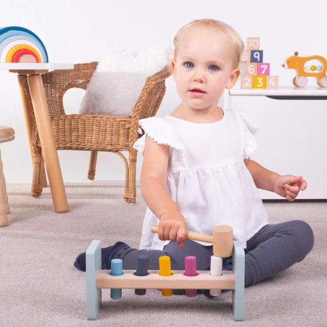 Divertente panca martellante in legno realizzata in legno 100% FSC con pioli colorati e martelletto. Durante il gioco i bambini allenano la motricità fine, la coordinazione mano-occhio e l'apprendimento dei colori. Una volta piantati i pioli, basta capovolgere la panca per giocare ancora e ancora. Colori atossici sicuri, bordi arrotondati e finitura di qualità. Per bambini dai 12 mesi, la confezione include 7 pezzi.