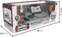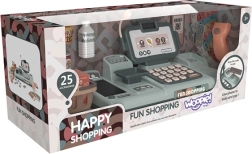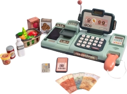 Comprende un registratore di cassa con bilancia, terminale, calcolatrice, scanner e molti accessori, inclusi uno smartphone giocattolo e diversi tipi di alimenti in plastica.