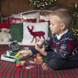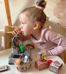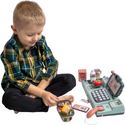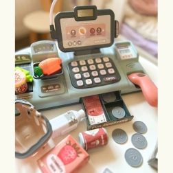 Il registratore include un terminale, attraverso il quale il bambino può effettuare pagamenti in contanti, con carta o smartphone, proprio come gli adulti nei negozi. La bilancia integrata e il nastro trasportatore permettono al bambino di organizzare gli acquisti e vivere il ruolo reale di un venditore.