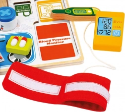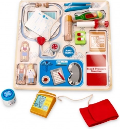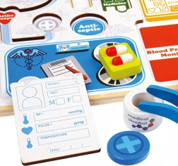 I bambini imparano in modo divertente a riconoscere stetoscopio, termometro, siringa e altri strumenti e a inserirli correttamente al loro posto.