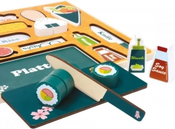 Il set include componenti in legno come sushi, salse, posate e un coltello per "tagliare", che permette un gioco realistico e creativo. Questo gioco è adatto a bambini dai 36 mesi, ma si consiglia la supervisione di un adulto per bambini al di sotto dei 3 anni.