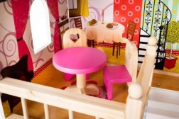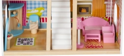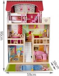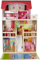 La casa delle bambole in legno è un giocattolo fantastico che sviluppa la creatività e le abilità sociali dei bambini. Ha tre livelli collegati da belle scale bianche e include un totale di cinque stanze, un balcone e un giardino con piscina. È dotata di vari elementi colorati e gradevoli che garantiscono lunghi momenti di divertimento.