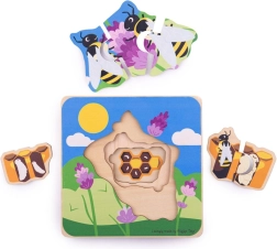 La costruzione a strati con immagini che cambiano progressivamente mostra le singole fasi di sviluppo, dall’uovo fino all’ape adulta. I pezzi sono dimensionati per le mani dei bambini e, grazie alla struttura solida, resistono anche a un uso frequente.