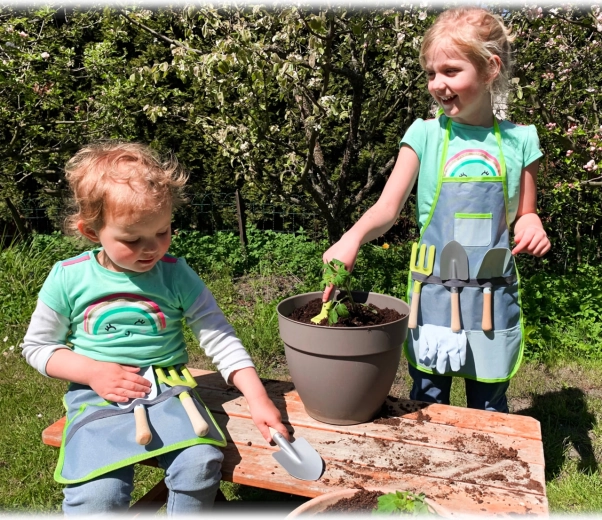 Il set è pensato per bambini dai 3 anni e non è ideale solo per il giardino, ma anche come grembiule da cucina o protezione durante pittura e attività creative. Il tutto è realizzato in colori moderni, apprezzati dai bambini e facili da pulire.
