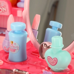 Inclusi pettini, specchietto, boccettine, accessori per capelli e altri elementi di scena per un gioco realistico da parrucchiere ed estetista.