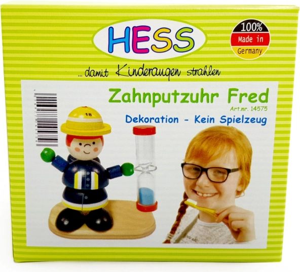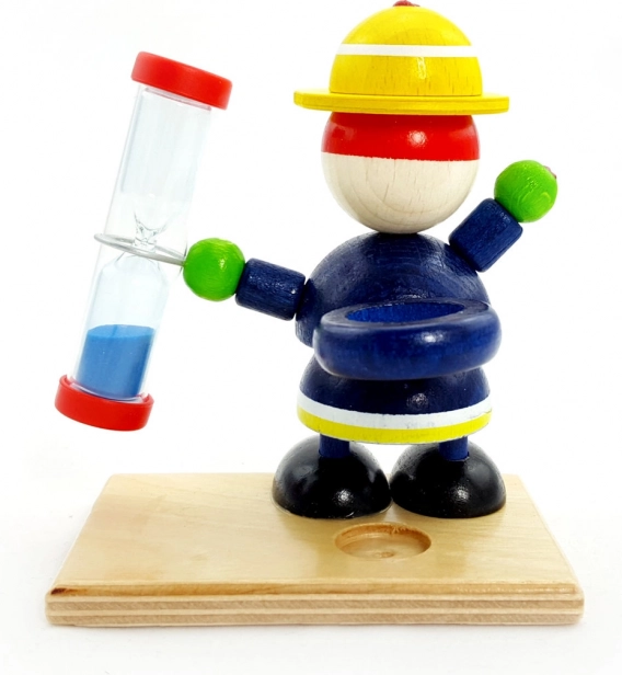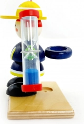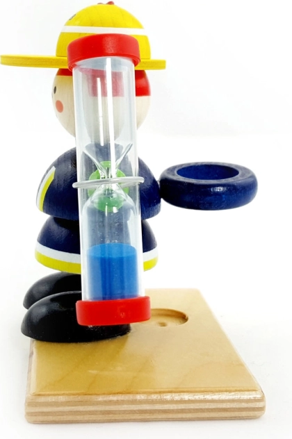 Questo colorato giocattolo in legno a forma di figurina, tenuto da un pompiere, è non solo decorativo ma anche funzionale. La clessidra può essere utilizzata come originale timer con sabbia di colore blu, un accessorio giocoso per la cameretta. Con una durata di 2 minuti, è ideale per motivare alla pulizia dei denti.