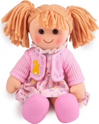 Ella, una bambola morbida e coccolosa, indossa un vestitino primaverile rosa, un maglioncino a maglia con motivo di coniglio e scarpette rosa coordinate, che la rendono una compagna adorabile per i giochi quotidiani. I suoi vestiti sono facilmente rimovibili e riabbinabili, incoraggiando lo sviluppo della motricità fine e della creatività.