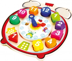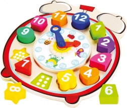Questo giocattolo educativo multifunzionale in legno unisce un puzzle a incastri a un orologio. I pezzi colorati di forme diverse con numeri si inseriscono nelle aperture corrispondenti e, sotto i pezzi, sono contrassegnati dei puntini per un orientamento più semplice e per i primi conti. Le lancette girevoli delle ore e dei minuti aiutano i bambini a comprendere il principio della misurazione del tempo in modo divertente e intuitivo.