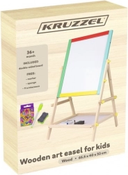 Questa lavagna doppia KRUZZEL offre due superfici per disegnare e scrivere: a gesso e cancellabile a secco. La semplice rotazione e le viti a farfalla permettono un rapido cambio di lato. La cornice in legno con elementi colorati è solida, liscia e sicura per i bambini.