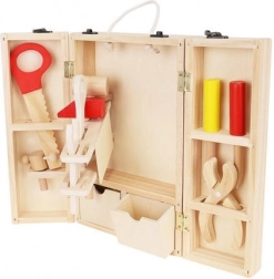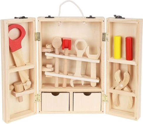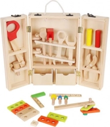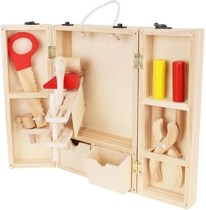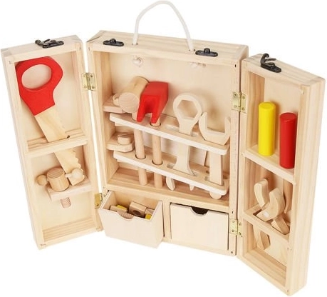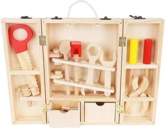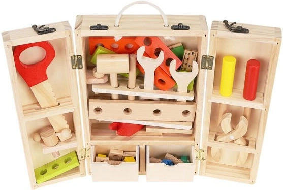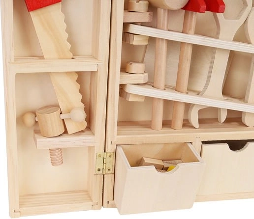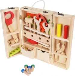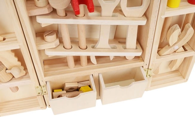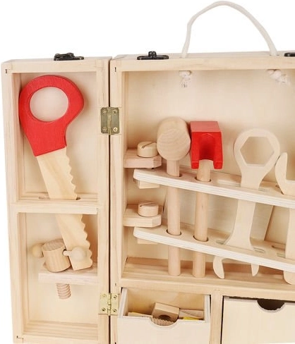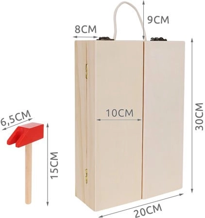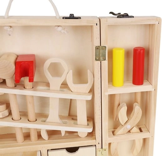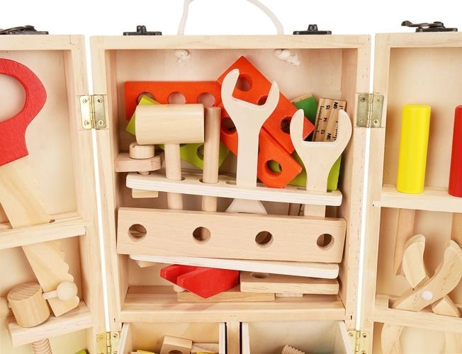 Oltre agli strumenti giusti, nella scatola ci sono anche accessori come tavole di legno con fori, dadi e viti. Rimane in bellissimi colori vivaci, attira gli occhi e invita il bambino a giocare. Perfetto come regalo per ragazzi e ragazze creativi. L'intero è realizzato in legno naturale con attenzione ai minimi dettagli, che stimolano la fantasia dei bambini fin dalla più tenera età e aiutano a familiarizzare con le proprietà di diversi oggetti. Il set può essere facilmente mantenuto pulito pulendo la custodia e gli accessori con un panno umido.
