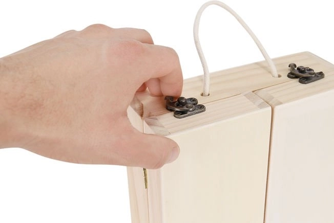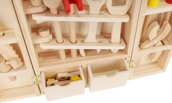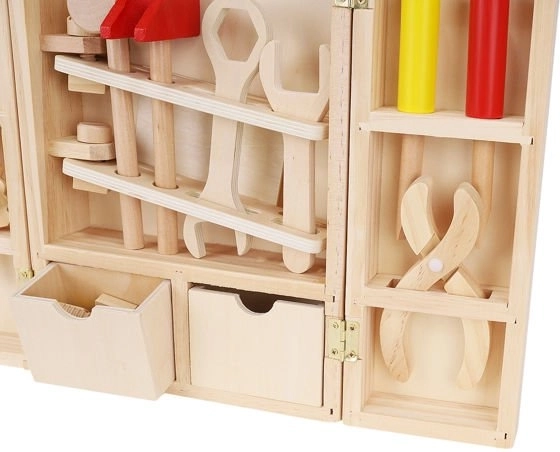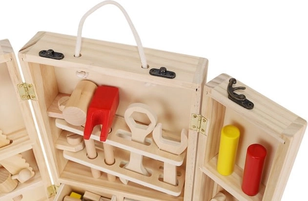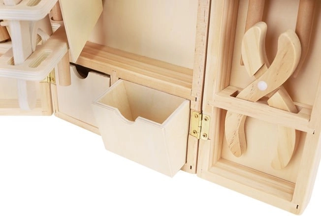 All'interno della custodia in legno ci sono molti scomparti, in cui il bambino può organizzare gli accessori. È dotato di speciali chiusure che permettono al bambino di trasportare il giocattolo senza paura di perdere o far cadere gli accessori.