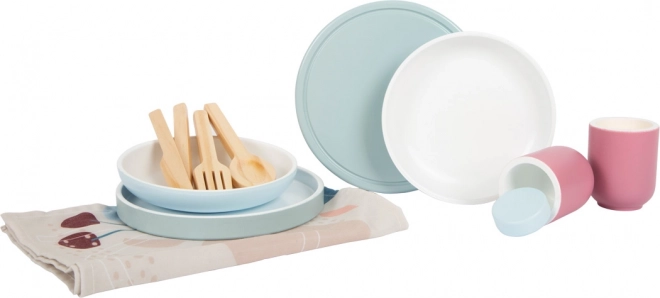Il set da pranzo per bambini Tasty di Small Foot porta nella tua casa un design moderno che combina legno naturale con colori blu fumo e rosso bacca. Questo set include piatti, tazze, posate e tovagliette per due persone, ideale per i piccoli chef che vogliono imparare una corretta etichetta a tavola.