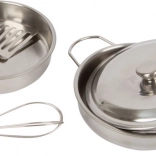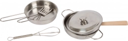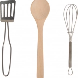Include pentola con coperchio, padella, frusta, spatola e cucchiaio di legno, che aiutano durante il gioco del cuoco.