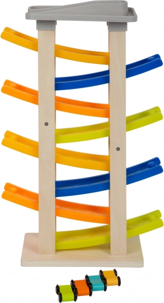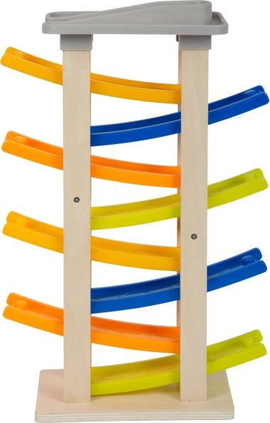 Scoprite questa pista da corsa unica con otto rampe, che entusiasmerà ogni piccolo pilota. In cima alla pista c'è un comodo parcheggio per quattro macchinine di legno. Questo giocattolo supporta la percezione acustica grazie ai suoni clacchétanti emessi dalle macchinine durante la discesa. Grazie alla sua ampia base, la pista è estremamente stabile e sicura.