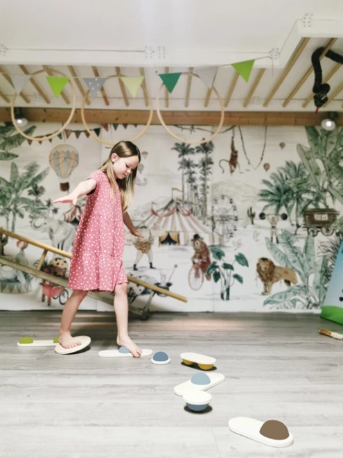 Questo gioco non è solo divertente, ma anche adatto per scopi terapeutici, contribuendo a sviluppare la capacità fisica, l'equilibrio e la coordinazione. Le forme arrotondate e il design semplice con elementi in legno naturale rendono queste pietre un accessorio esteticamente piacevole per ogni stanza.