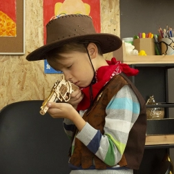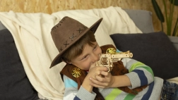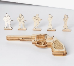 Oltre alla pistola, la confezione include cinque figure di legno che servono come bersagli. Sono inclusi anche proiettili di gomma che la pistola può sparare a una distanza di fino a cinque metri. Questo modello offre non solo divertimento, ma può anche fungere da elemento decorativo sulla tua scrivania o mensole.