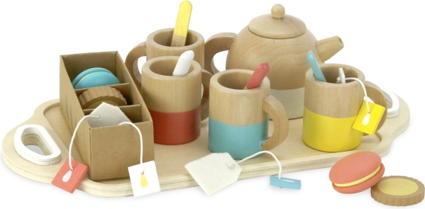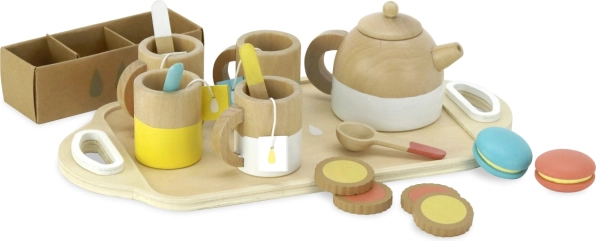 Il set include: 4 tazze, 4 cucchiaini, 1 teiera, 4 bustine di tè, 2 macaron, 4 biscotti in scatolina e 1 vassoio. Tutto è realizzato in legno di qualità con bordi lisci per un gioco sicuro e duraturo. Favorisce lo sviluppo della fantasia, del linguaggio e delle competenze sociali.