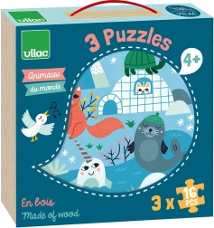 Tre puzzle con immagini di savana, foresta e ghiacciai che mostrano ai bambini il mondo degli animali nel loro ambiente naturale.