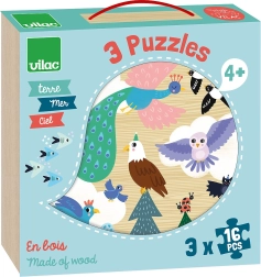 Set di 3 bellissimi puzzle di legno illustrati, che rappresentano scene dal mare, dalla terra e dall'aria. Le illustrazioni sono opera di Michelle Carlslund, famosa illustratrice danese.