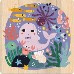 Scoprite il meraviglioso mondo della natura attraverso questo set di puzzle di legno. Ogni immagine delle tre presenta un tema diverso: avventure tra le nuvole, il mondo sottomarino e avventure nella giungla. La scena nel cielo è impreziosita da un bellissimo pavone, un'aquila e altri uccelli. I motivi marini sono animati da una grande balena, un polpo e pesci amichevoli. La scena terrestre include una tigre, un coccodrillo e un pappagallo in un allegro ambiente giungla.