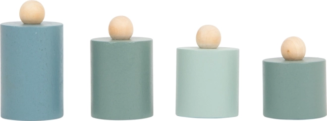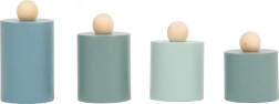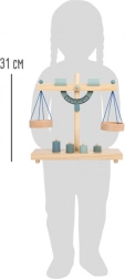 I bambini comprendono facilmente il principio della bilanciatura grazie ai due piatti e a quattro pesetti in legno di diverse masse.