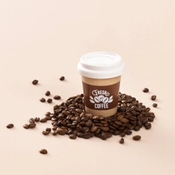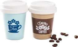 Due bicchieri curati nei dettagli, “Fresh Coffee” e “Tea”, con coperchi bianchi che aggiungono un tocco autentico ai giochi di caffetteria e angolo del tè.