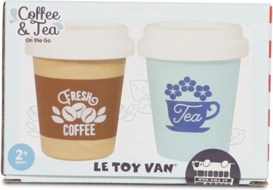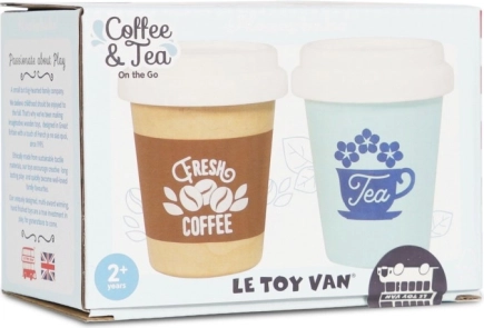 Elegante set per bambini con due bicchieri da caffè e tè da asporto di LE TOY VAN per un gioco realistico. Realizzato in legno FSC, senza plastica e dipinto con vernici atossiche a base d'acqua. Perfetto per la cucina giocattolo e per giocare al negozio, stimola la creatività e lo sviluppo delle abilità sociali.