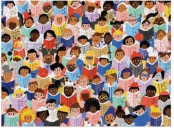 La rappresentazione coloratissima dei bibliofili di Carolyn Suzuki trasforma ogni sessione di puzzle in un'esperienza visiva e un divertimento per tutte le età.