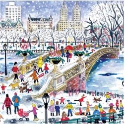 Bow Bridge e il Central Park invernale raffigurati in colori vivaci grazie al talento dell'artista Michael Storrings.