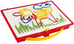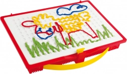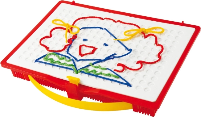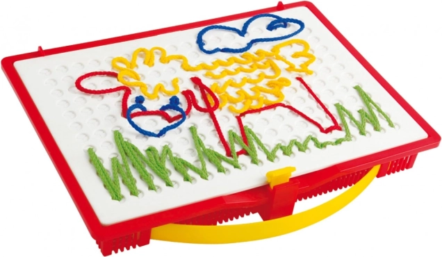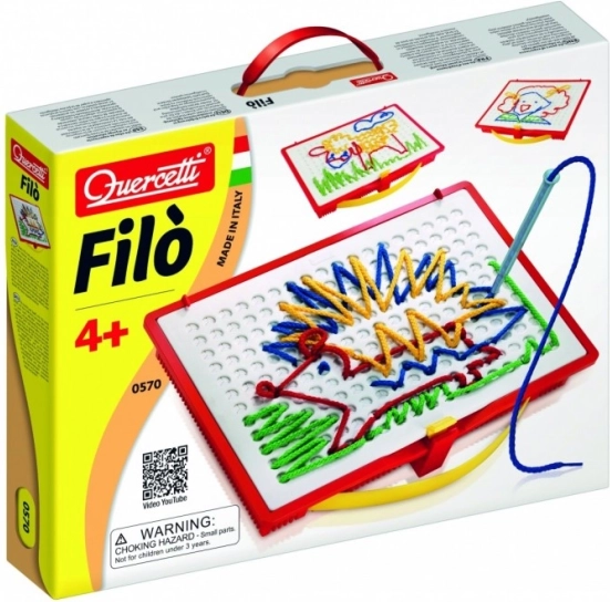Scopri la magia del gioco creativo con il set di ricamo Quercetti Filò, che supporta la fantasia dei bambini e la motricità fine. Con penne speciali, i bambini possono creare diverse immagini inserendo fili colorati nei fori della tavola da gioco, portando loro gioia e divertimento.