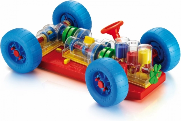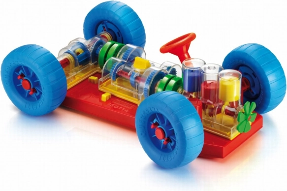 - Il giocattolo permette di sollevare l'auto sia davanti che dietro con speciali cunei e di attivare il meccanismo girando una maniglia sul davanti. Durante il cambio marcia, si noterà la variazione della velocità di movimento delle ruote e dei cilindri. In posizione neutra, si potrà osservare come il motore e il differenziale si disconnettano.