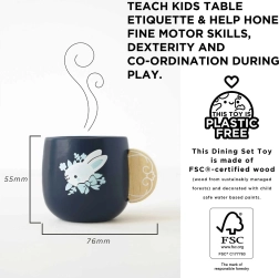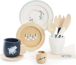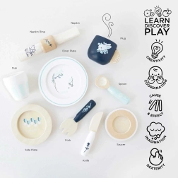 Nella confezione trovi tutto per il piccolo apparecchiamento: tazza, piattino, bicchiere, 2 piatti, coltello, forchetta, cucchiaio e tovagliolo in tessuto con anello decorativo. Servendo, i bambini sviluppano creatività, destrezza e apprendono le basi del galateo a tavola. Prodotto eticamente in legno sostenibile certificato FSC con attenzione a qualità e sicurezza.