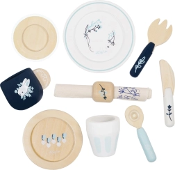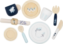 Tazza, piattino, bicchiere, 2 piatti, posate e tovagliolo con anello decorativo: tutto ciò di cui i bambini hanno bisogno per servire e esercitarsi a tavola.