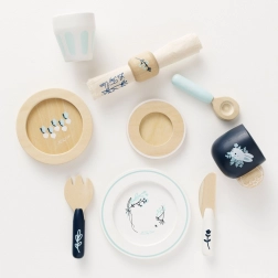 Questo set da tavola per bambini di alta qualità è progettato per durare nel tempo e, al contempo, per valorizzare ogni cameretta. Motivi eleganti blu e bianchi con illustrazioni botaniche, superfici in legno levigate e colori a base d'acqua sicuri lo rendono una scelta ideale per il gioco quotidiano.