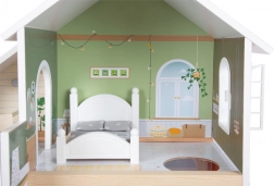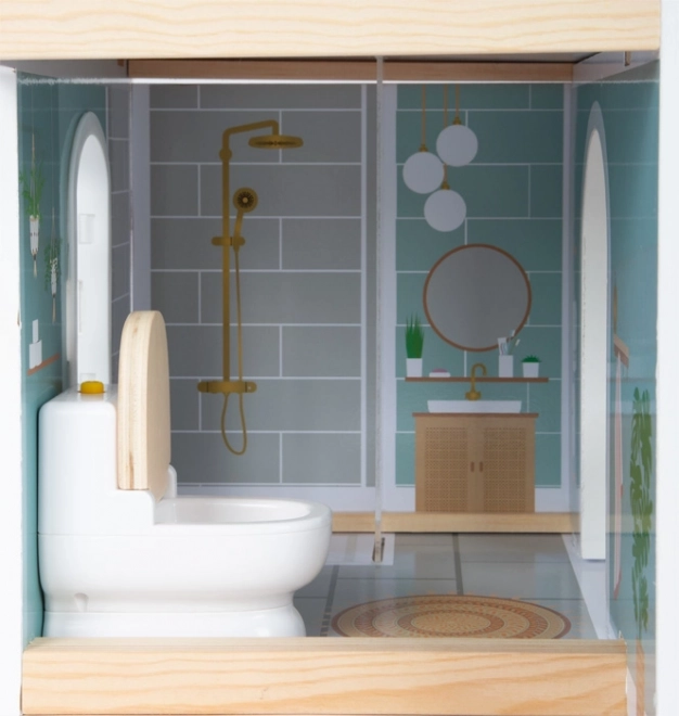 Questa casetta per bambole dal design moderno propone un concept abitativo aperto con cucina e zona pranzo, camera da letto, bagno e un’ampia terrazza con area salotto. Grazie al lato aperto, il gioco è accessibile dal fronte e consente a più bambini di divertirsi contemporaneamente. La facciata chiara e i toni neutri si adattano a qualsiasi interno.