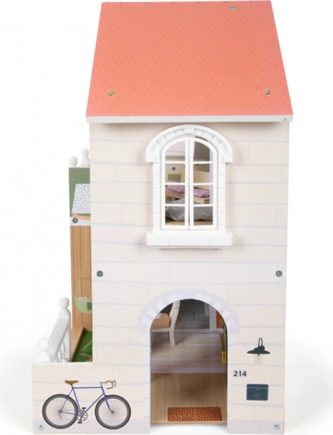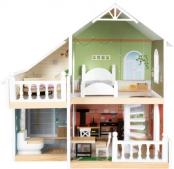 Elegante casetta in legno per bambole con lato frontale aperto, dotata di tre stanze, terrazza e giardinetto per un gioco realistico. Non mancano la scala a chiocciola, le finestre apribili, il bagno moderno con parete in plexiglass e 8 pezzi di arredo funzionale con accessori tessili. La struttura compatta e stabile dal design moderno e luminoso è ideale sia per la cameretta sia per il soggiorno.