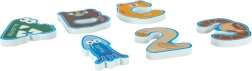 Lettere e numeri colorati con animaletti invogliano i bambini a riconoscere e comporre le prime parole e a contare direttamente nella vasca.