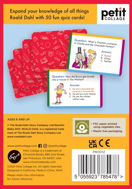 Diventa un maestro delle storie di Roald Dahl grazie alle carte quiz che mettono alla prova memoria e conoscenze. Contengono 50 carte con domande che offriranno a te e alla tua famiglia un ottimo divertimento a casa o in viaggio. Grazie alle illustrazioni di Sir Quentin Blake, le carte sono anche una gioia per gli occhi. Realizzate in carta certificata FSC al 100% e stampate con inchiostri a base vegetale, rispettano rigorosi standard ecologici.